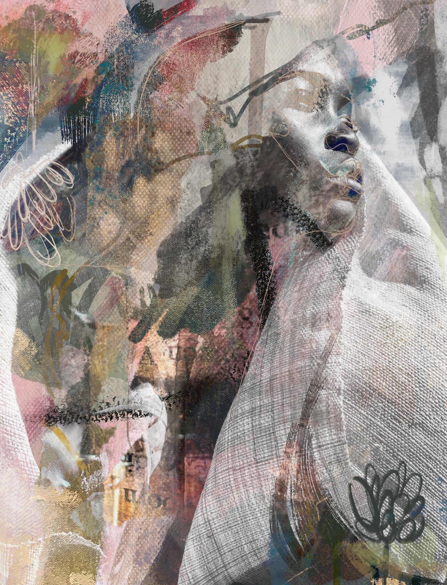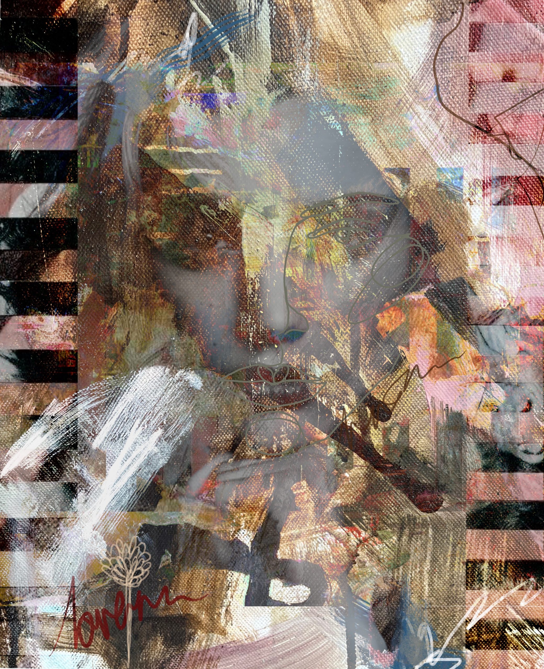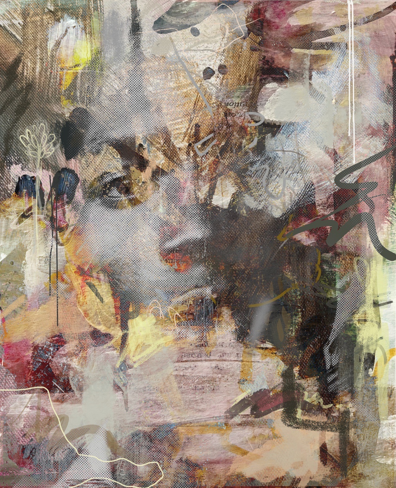 Mické Buitendag arbeitet hauptsächlich auf hochglänzenden Acryloberflächen und verbindet digitale und traditionelle Medien zu ausdrucksstarken, abstrakten Kompositionen. Ihr kreativer Prozess entfaltet sich in drei verschiedenen Schichten, beginnend mit abstrakter Malerei auf Leinwand. Durch Schichten von Texturen, dynamischen Pinselstrichen und durchscheinenden Lasuren entstehen fragmentierte und multiperspektivische Gesichter – Porträts, die die Komplexität des menschlichen Denkens und die vielen Schichten der Identität widerspiegeln.